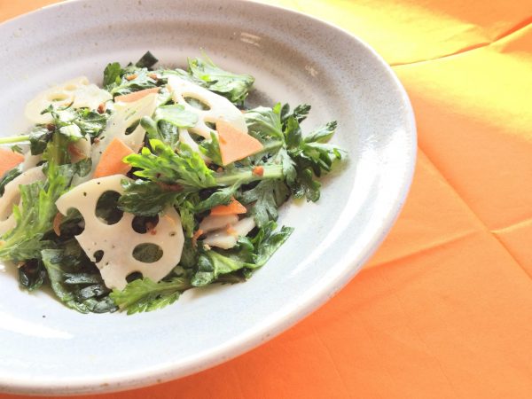 しっかり水気を切り、春菊・人参とともに深鉢に盛る。