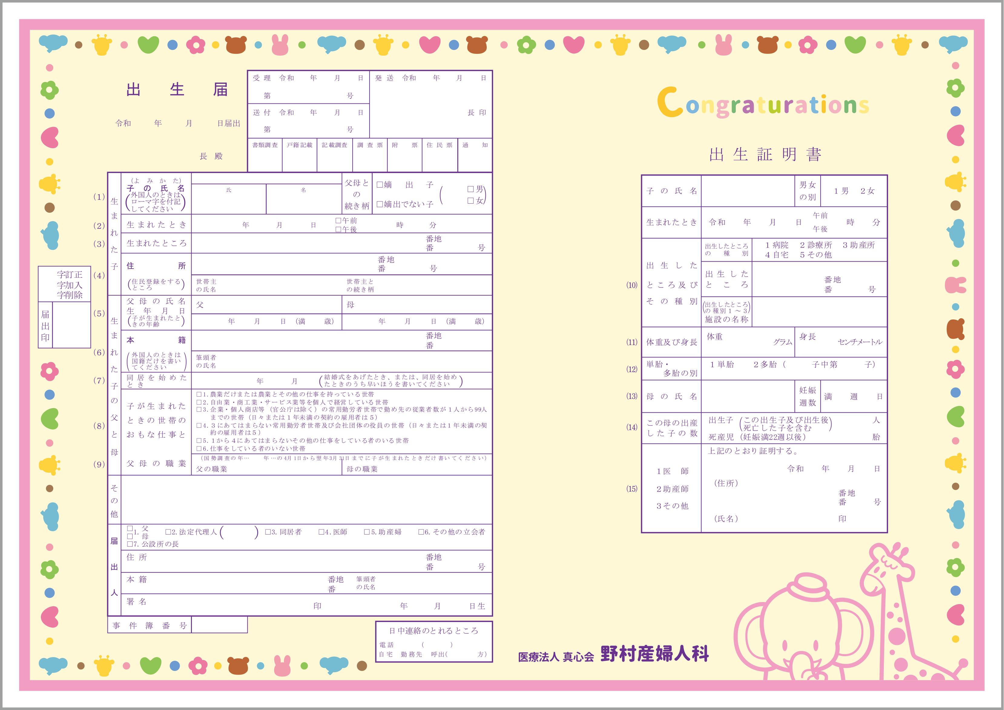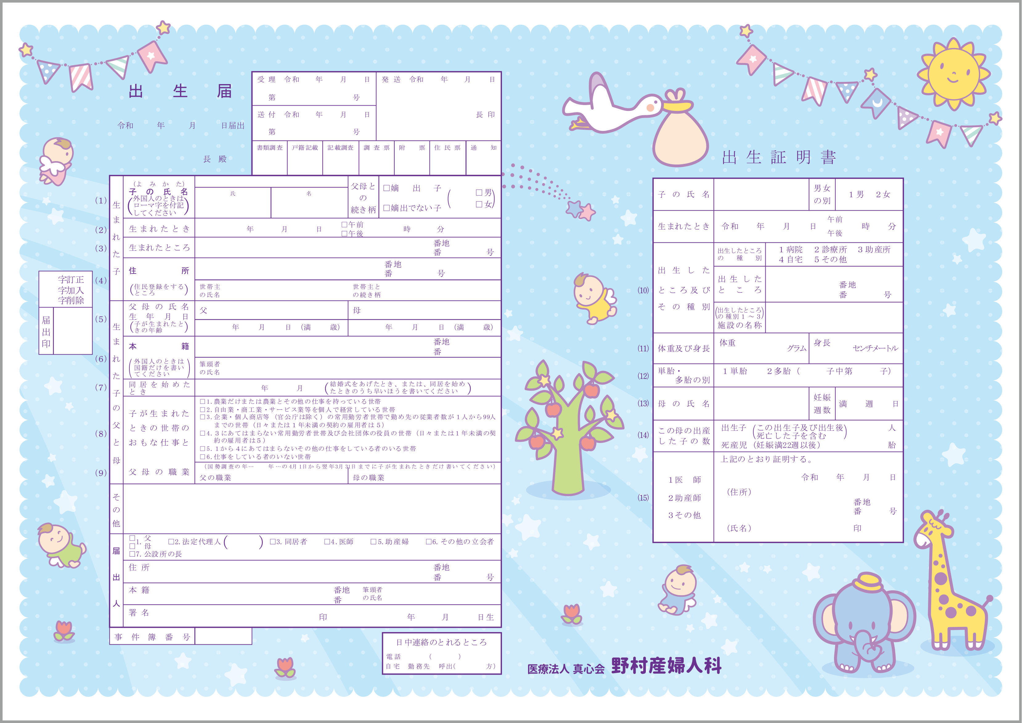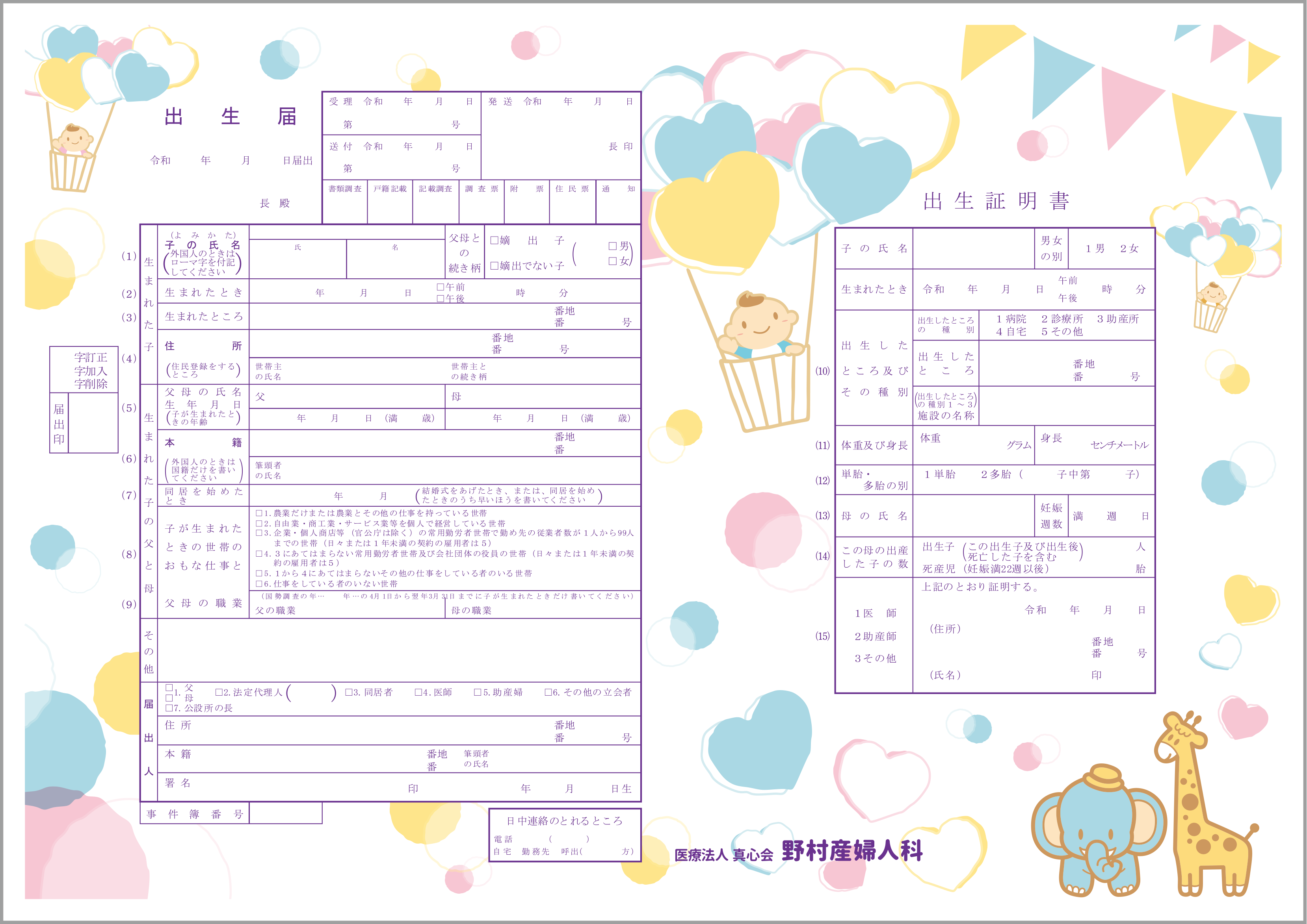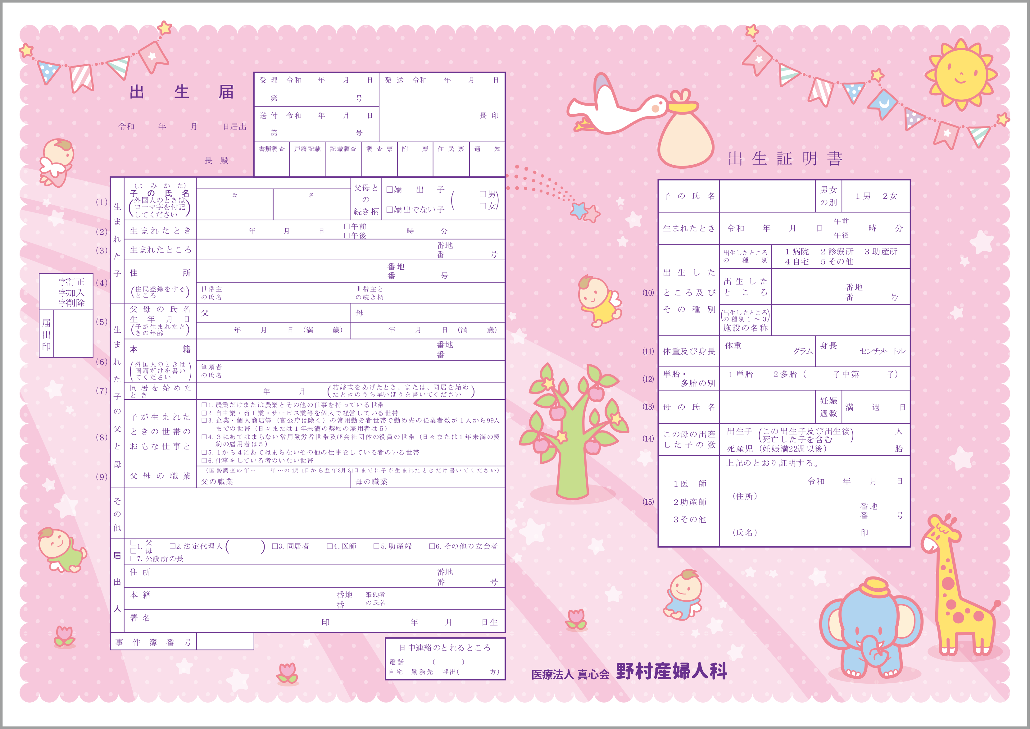 当院では、新たな家族の誕生をお祝いするとともに、健やかな成長と幸せを願ってオリジナルの出生届をご用意しております。