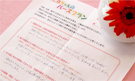 当院では、バースプランに綴られた、ご自身が希望されるお産を迎えていただけるようにお手伝いさせていただきます。医学的に困難と思われる点については、充分に説明させていただきます。